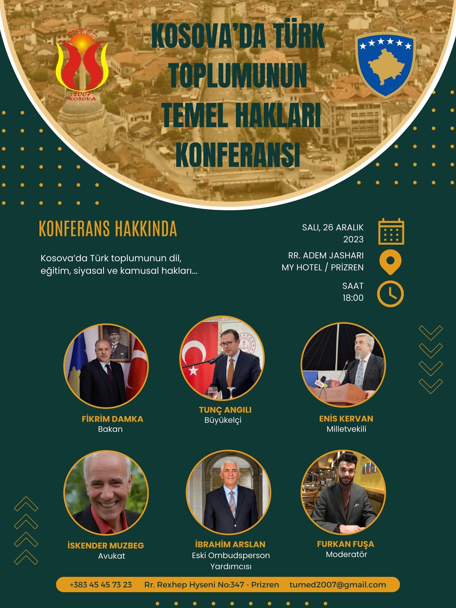 26.12.2023 tarihinde Kosova Geri Dönüş ve Topluluklar Bakanlığı destekleriyle ve Türkiye Mezunları Derneği (TÜMED) işbirliğinde gerçekleştireceğimiz “Kosova’da Türk Toplumunun Temel Hakları ve Türkçe” adlı projemizin ikinci ayağı olan “Kosova’da Türk Toplumunun Temel Hakları Konferansı” düzenlenecektir.